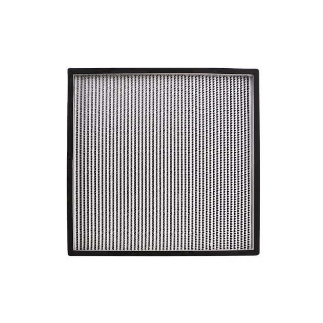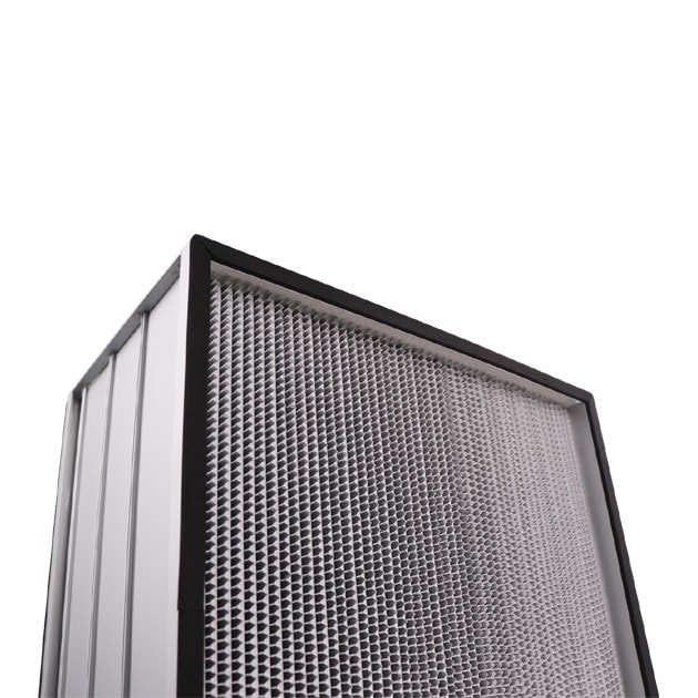 This high-efficiency air filter has a partition, the filter material is ultra-fine glass fiber, the partition is glued cardboard or aluminum foil, and then glued and composited with a wooden frame or an aluminum alloy frame. High filtration efficiency, low resistance, large air volume, suitable for various local purification equipment and terminal filtration of clean workshops